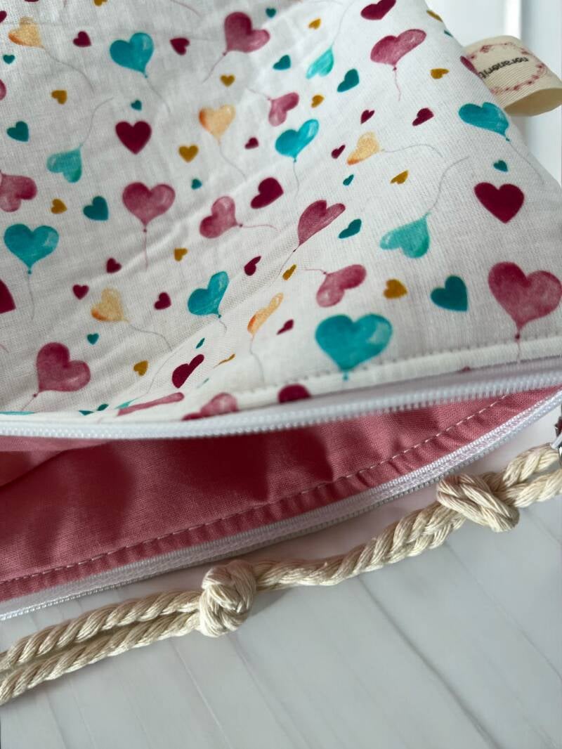 "¡Lleva la diversión y la practicidad a la playa con la bolsita multiusos infantil hecha a mano! Confeccionada con 100% algodón, esta bolsita presenta un encantador diseño de corazones en el exterior y un suave tono rosa viejo en el interior. Ideal para llevar las cremas y accesorios de los más pequeños, ¡o incluso para ti misma! Si te encanta este adorable accesorio y deseas adquirirla, contacta directamente conmigo. ¡No te quedes sin la tuya! #BolsitaMultiusos #HechoAMano #Algodón100%"